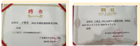 榮獲2020并聘為廣西大學青年農場主學院創(chuàng)業(yè)孵化導師